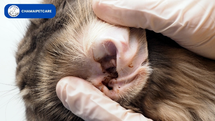 - ผิวหนังบริเวณหูแดง บวม หรือมีแผล: เกิดจากการที่แมวเกาอย่างรุนแรงจนเกิดการบาดเจ็บ