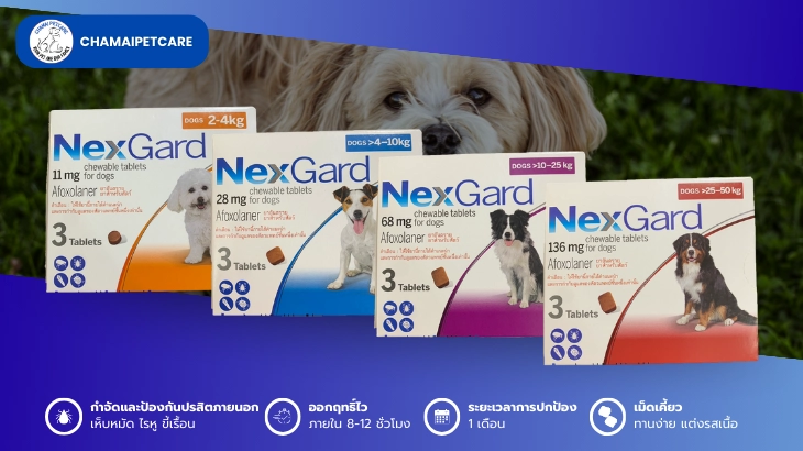 NexGard ถือว่าเป็นต้นตำรับยุคแรกๆของยากินกำจัดเห็บหมัดที่ค่อนข้างมีประสิทธิภาพ ด้วยการมาถึงของตัวยา (Afoxolaner) มีประสิทธิภาพในการกำจัดและป้องกันปรสิตภายนอก เช่น เห็บ หมัด ไรหู ไรขี้เรื้อน ขี้เรื้อนเปียก ขี้เรื้อนแห้ง และช่วยลดอาการอักเสบของผิวหนังที่เกิดจากไรขี้เรื้อนเปียก (Demodex) และไรขี้เรื้อนแห้ง (Sarcoptes)