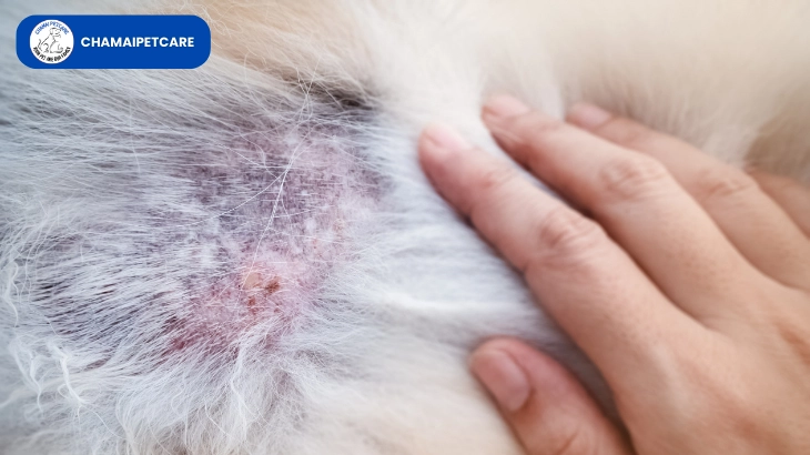- ผิวหนังแดง/มีสะเก็ด: บริเวณที่ขนร่วงอาจมีลักษณะแดง แห้ง มีขุยสีขาว/เทาคล้ายรังแค หรือมีสะเก็ดเป็นวง